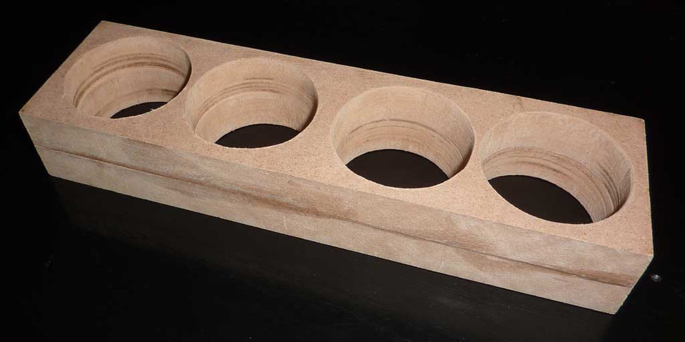 Izdelava nosilcev za banke kondenzatorjev: V Hobiju so mi iz mediapan plošč izrezali štiri pravokotnike, ki sem jih va parih zlepil, nato pa