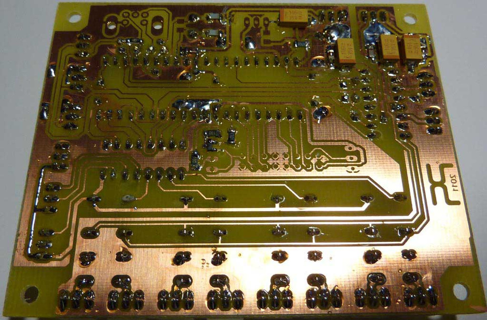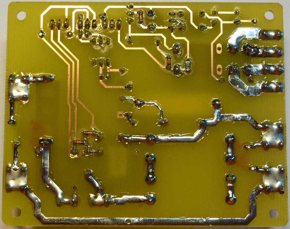 Spodnja stran vezja za usmerjanje in distribucijo močnostne sekundarne napetosti še pred spajkanjem ojačitev vezja in pred nanešeno zaščito vezja: