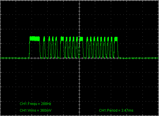 Takole izgleda signal iz daljinskega upravljalnika, kot ga vidi IR dioda, ki sem jo priključil na osciloskop. Namesto diode bi lahko uporabil