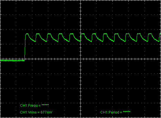 Na vrhu signala je vidno, da je signal precej kosmat. Ob spremembi časovne baze na osciloskopu (200ms -> 40us) se slika spremeni: