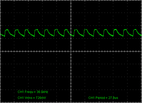 Ko sem triger točko rahko premaknil je osciloskop ujel nihajno frekvenco 36,0kHz, kar je nihajna frekvenca tega oddajnika.