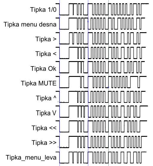 upravljalniku. Srednji del vlaka podatkov, ki je vedno enak pa sem porabil za to, da se dekodirajo samo signali, ki jih pošilja ta daljinski upravljalnik.