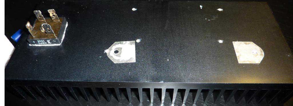 Najprej sem se lotil ojačevalcev. Po demontaži sem najprej pod izolatorja tranzistorjev nanesel termalno pasto: