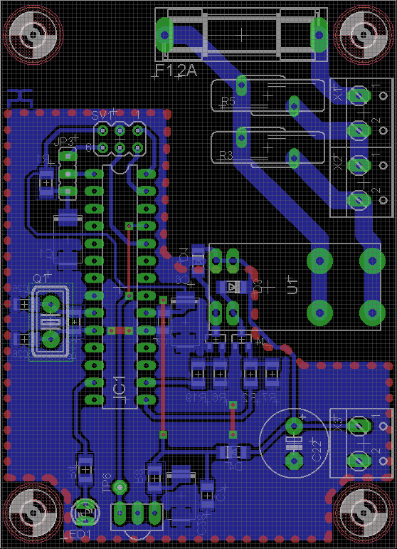 Tiskano vezje je veliko 58x80mm. Sem pa pri prvem poizkusu naredil dve napaki. Zaradi površnosti sem IR sprejemnik zvezal na RB0, ker sem mislil, da kompletni