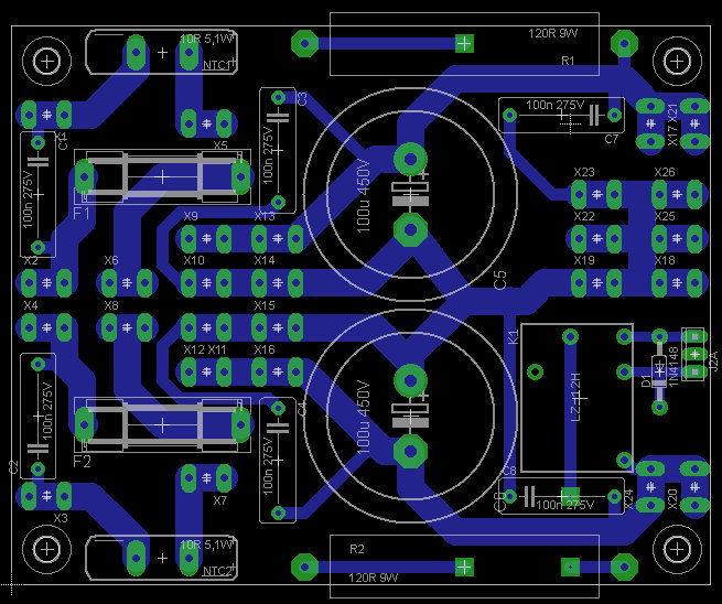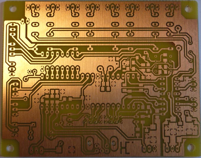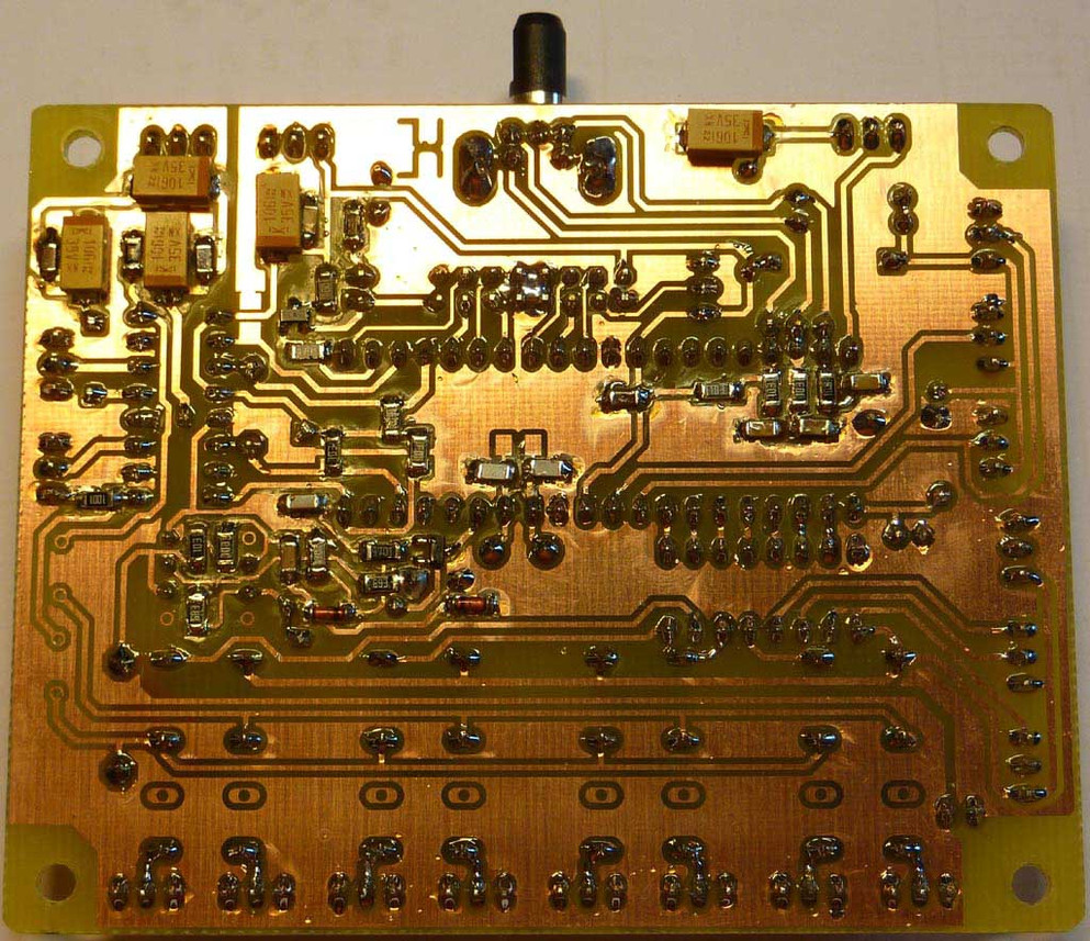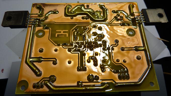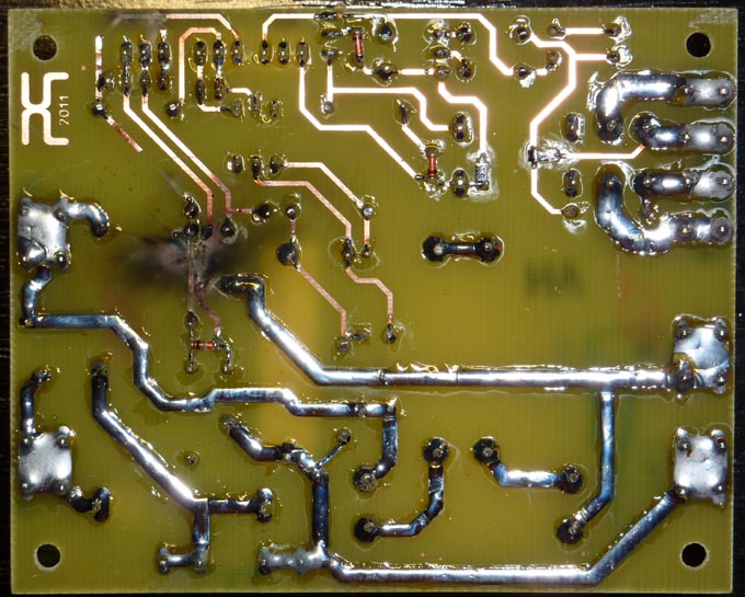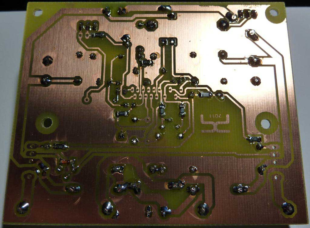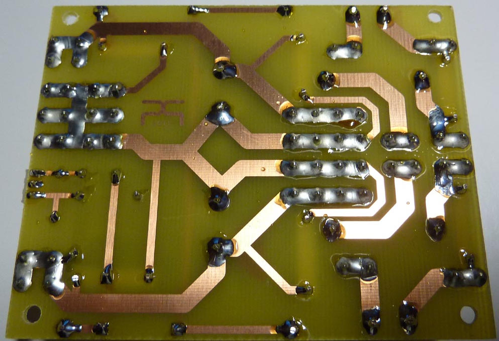 Spodnja stran vezja za usmerjanje in distribucijo močnostne sekundarne napetosti še pred spajkanjem ojačitev vezja in pred nanešeno zaščito vezja: