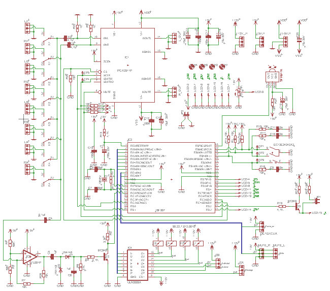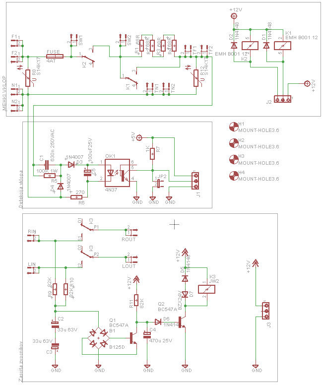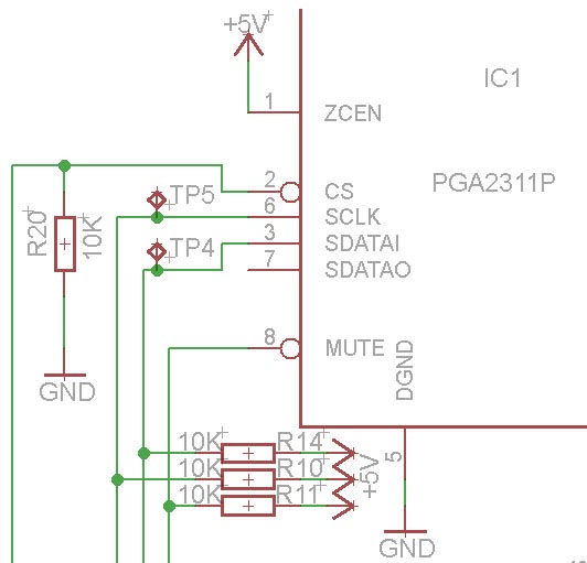 Na shemi je preko upora R1 na 0V vezan še elektrolitski kondenzator C1 - 47uF, ki ob vklopu vhod MUTE veže na 0V in s tem prepreči pokanje v zvočnikih.
