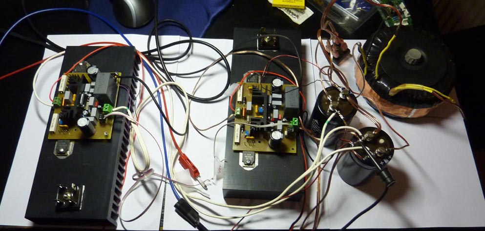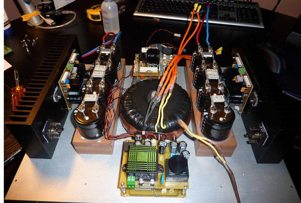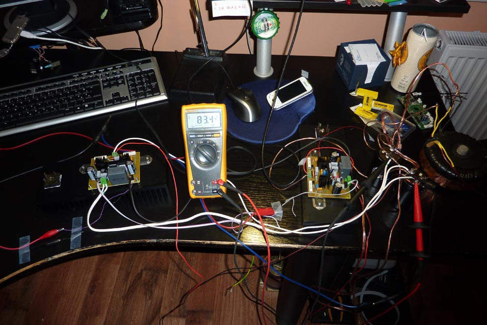 Prototipna postavitev gasilska slika. :-) Vidna je tudi banka kondenzatorjev glavnega usmernika.
