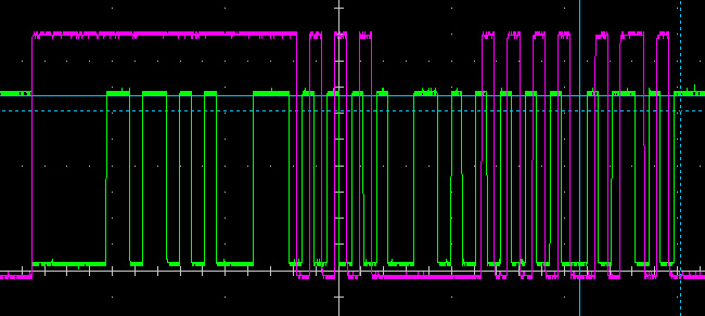 tako kot je procesor dekodiral signal. To je vidno kot roza diagram na spodnji sliki. Zelen signal je izhod iz IR sprejemnika, roza pa izhod,